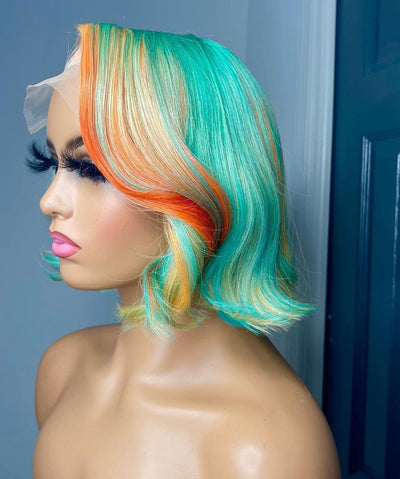 Green Orange Highlight Wavy Human Hair Lace Front Wig