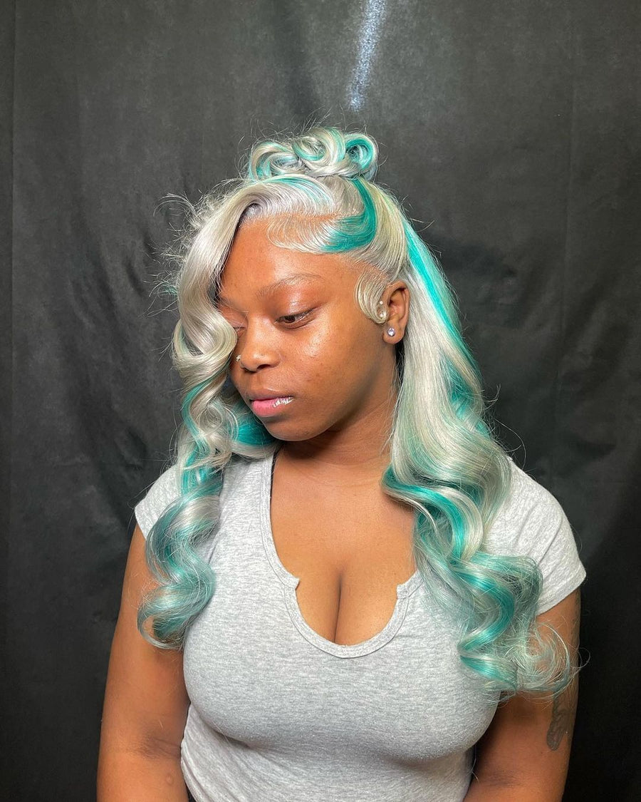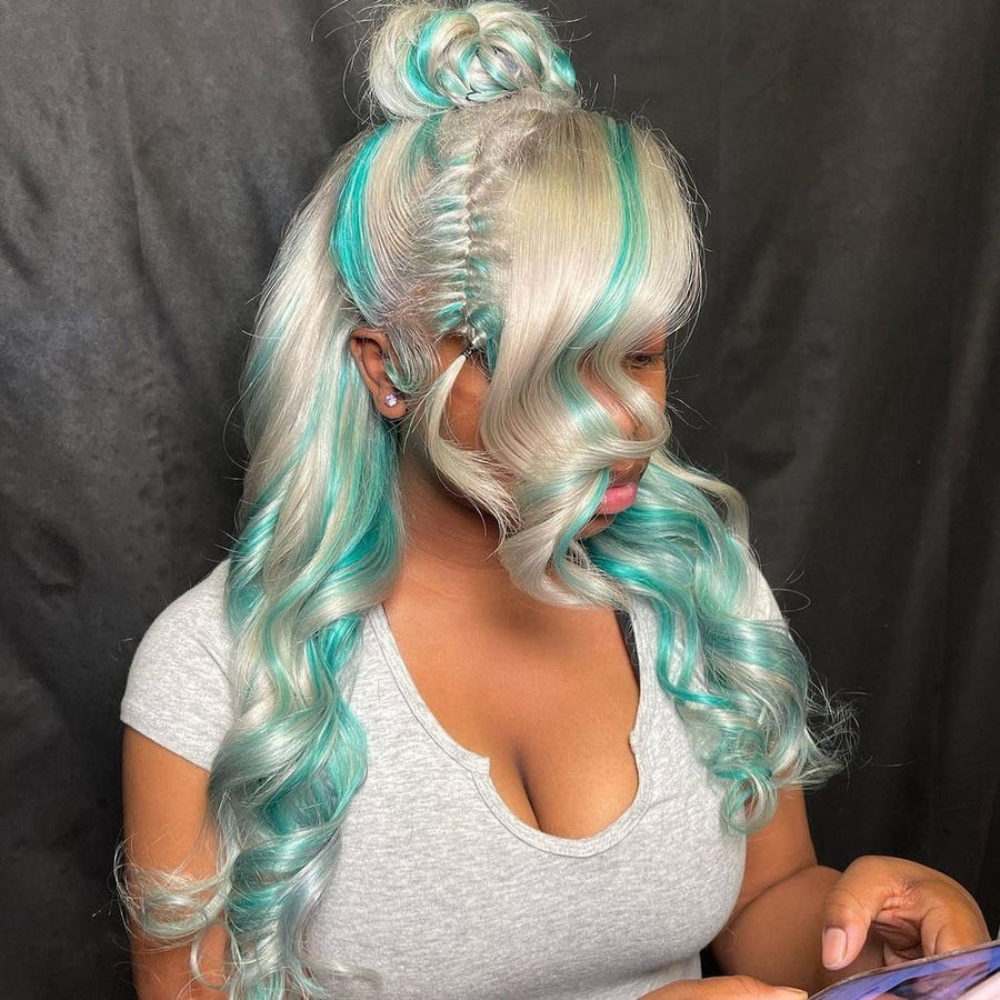 Silver Green Highlight Wavy Ombre Lace Front Wig Human Hair Wig